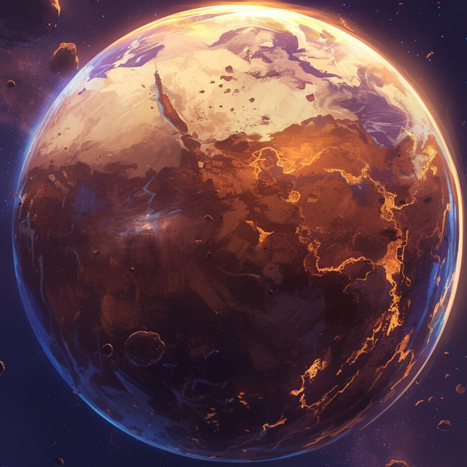 Desolara is a unique planet in the known universe, characterized by its twin suns that cast an eternal, scorching daylight upon its surface. There is no respite from the relentless heat, making it the hottest and driest planet known to exist. Despite its inhospitable conditions, it is inhabited by a resilient species of lizard-like aliens. These creatures have evolved to thrive in the extreme environment of Desolara, equipped with heat-resistant scales and the ability to survive for long periods without water. They navigate the unforgiving landscape with agility and adaptability, carving out a harsh existence in the relentless glare of the dual suns.